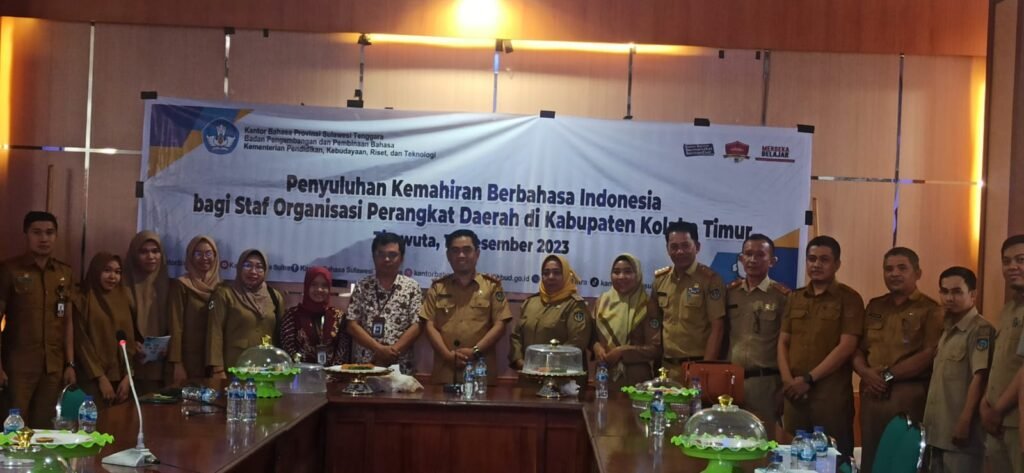 Kegiatan ini dihadiri oleh Kepala OPD Lingkup Kabupaten Kolaka Timur yang sempat Hadir, Peserta kegiatan penyuluhan Kemahiran Berbahasa Indonesia. Dalam kegiatan ini peserta terdiri dari para Pejabat dan Staf OPD lingkup Kab. Kolaka Timur, Staf Kecamatan. Yang menjadi narasumber pada kegiatan ini adalah Kantor Bahasa Provinsi Sulawesi Tenggara yaitu Dr. Uniawati, S.Pd., M.Hum, Sukmawati, S.Pd., M.Hum, Dan Jamaluddin M., S.S., M. Hum. Pelaksanaan kegiatan ini dilaksanakan pada Senin 18 Desember 2023 di Aula Lantai II Kantor Bupati Kolaka Timur.