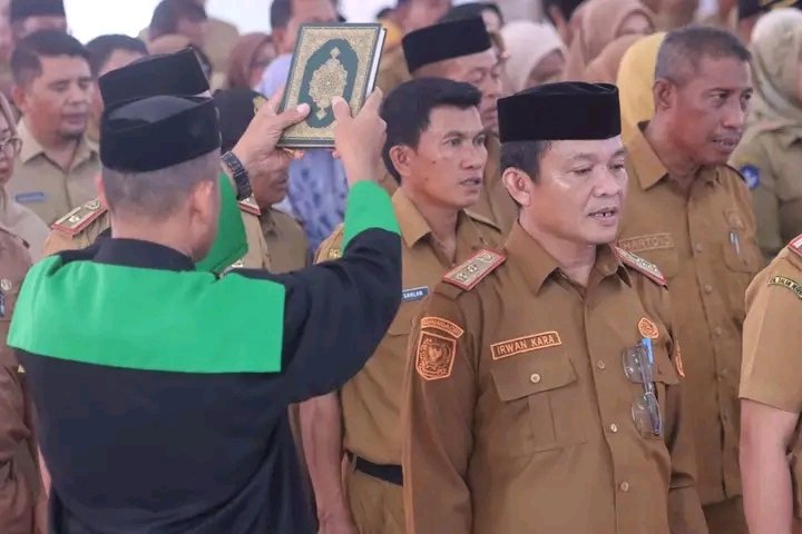 ”Jabatan dan tanggungjawab ini jangan dipikir sebagai hadiah, atau rahmat yang penuh dengan kesenangan, tapi jabatan itu adalah kehendak Allah SWT, makanya teruslah bekerja sesuai dengan aturan dan tupoksi yang diberikan,” ucap bupati mengawali sambutan.