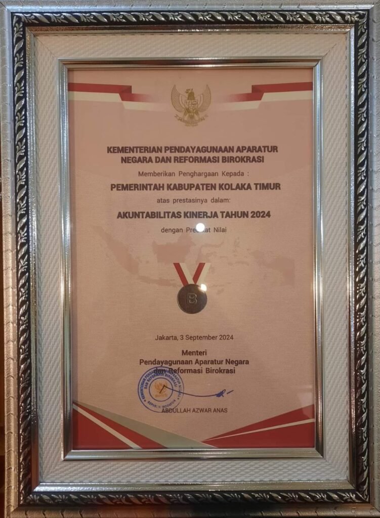 Ulasfaktasultra.com, Koltim –Pemerintah Kabupaten Kolaka Timur atau , meraih predikat B atas Sistem Akuntabilitas Kinerja Instansi Pemerintah (SAKIP) dari Kementerian Pendayagunaan Aparatur Negara dan Reformasi Birokrasi (Kemenpan-RB) RI.