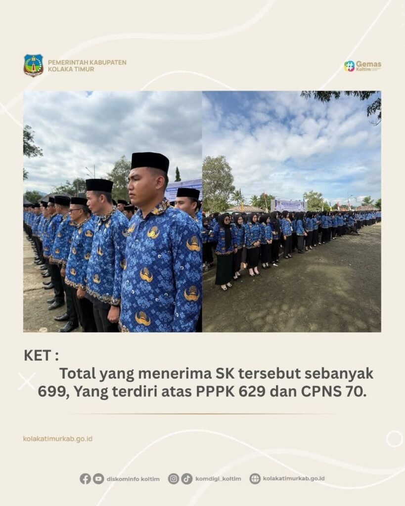 Sebanyak 70 orang CPNS dan 629 orang PPPK resmi menerima SK pengangkatan dalam acara tersebut. Penyerahan ini menjadi penanda dimulainya pengabdian mereka sebagai bagian dari Aparatur Sipil Negara (ASN) di lingkungan Pemerintah Kabupaten Kolaka Timur. Momentum ini juga menjadi puncak dari proses panjang yang telah dilalui para peserta, mulai dari tahap pendaftaran, seleksi administrasi, ujian kompetensi, hingga tahapan verifikasi lainnya.