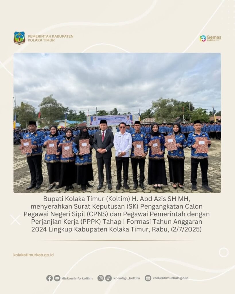 Ulasfaktasultra.com, Koltim –Bupati Kolaka Timur, H. Abd. Azis, SH., MH secara resmi menyerahkan Surat Keputusan (SK) pengangkatan kepada Calon Pegawai Negeri Sipil (CPNS) dan Pegawai Pemerintah dengan Perjanjian Kerja (PPPK) untuk formasi tahun anggaran 2024. Rabu 2/72025