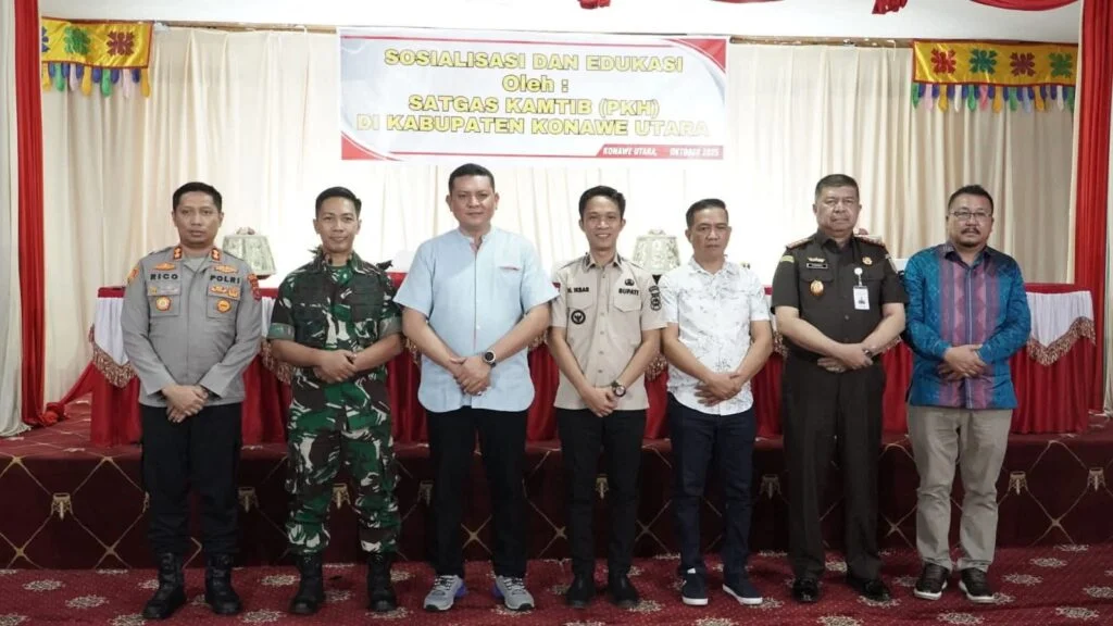KONUT, ulasfaktasultra.com – Bupati Konawe Utara, Ikbar, menyambut secara resmi kedatangan Tim Satuan Tugas Penertiban Kawasan Hutan Republik Indonesia (Satgas PKH) di Aula Kantor Bupati Konawe Utara, Kamis (16/10/2025).