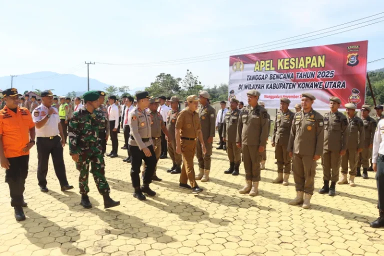 KONUT, Ulasfaktasultra.com – Kepala Kepolisian Resor (Kapolres) Konawe Utara, AKBP Rico Fernanda, S.H., S.I.K., M.H., didampingi Wakil Bupati Konawe Utara, H. Abu Haera, S.Sos., M.Si., memimpin Apel Kesiapan Tanggap Bencana 2025 di wilayah hukum Polres Konawe Utara, Rabu (5/11/2025).
