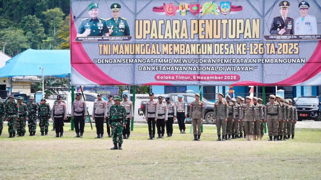 Ulasfaktasultra.com, Koltim- Pemerintah Kabupaten Kolaka Timur (Koltim) bersama Komando Distrik Militer (Kodim) 1412/Kolaka – Kolaka Timur menggelar Upacara Penutupan TNI Manunggal Membangun Desa (TMMD) ke-126 Tahun Anggaran 2025 yang berlangsung khidmat dan penuh semangat kebersamaan di Desa Ueesi, Kecamatan Ueesi, Kab. Koltim, pada Kamis (6/11/2025).